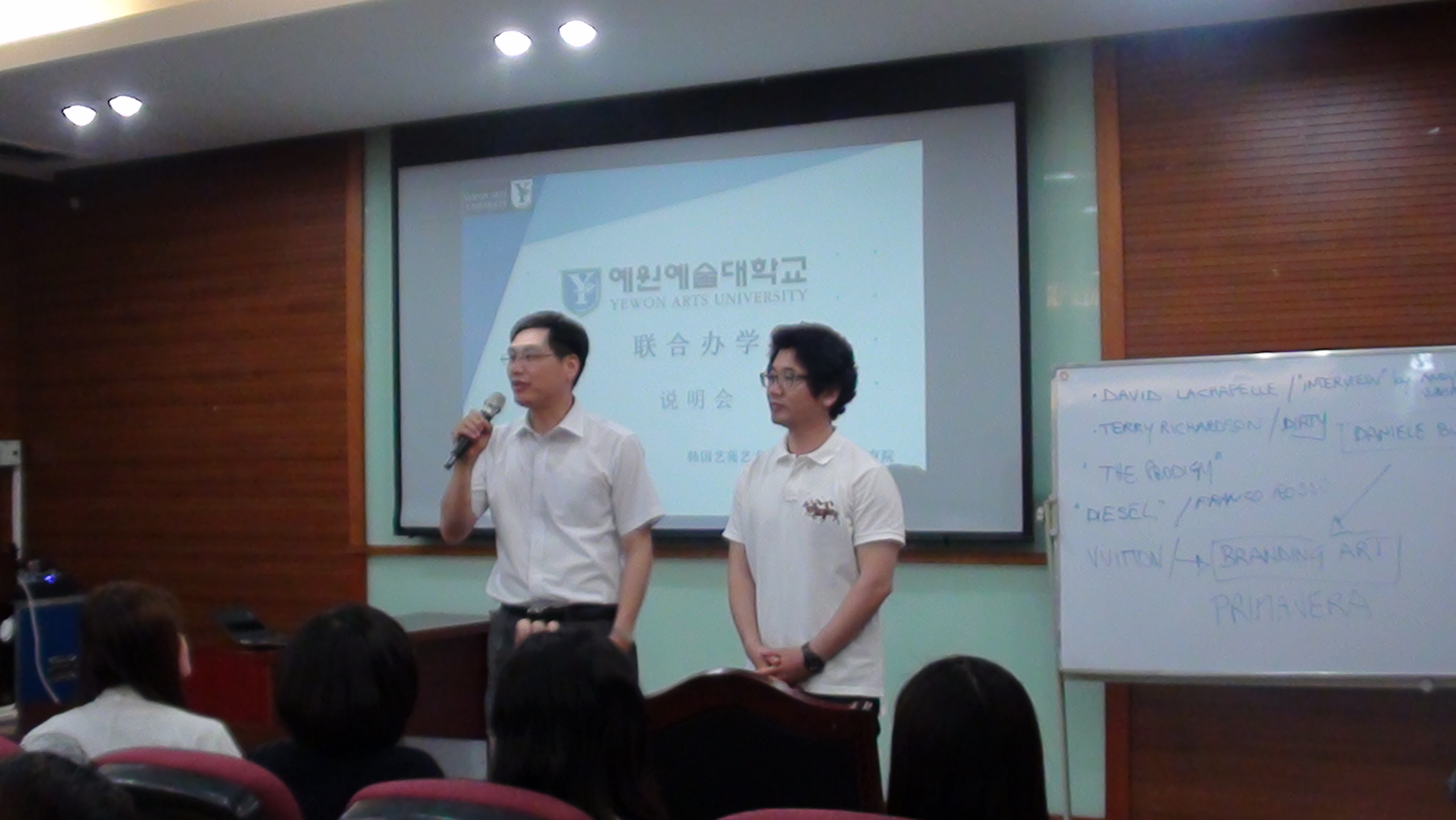 2012年5月14日下午,在外语楼102举行了由国际教育院长张海波主讲的韩国艺苑艺术大学的宣传介绍会。此次活动主要由国际教育中心承办。到场的嘉宾有国际学院的韩语专业教授以及各位韩语专业的老师。韩语班以及动漫专业班级的同学参加此次活动。