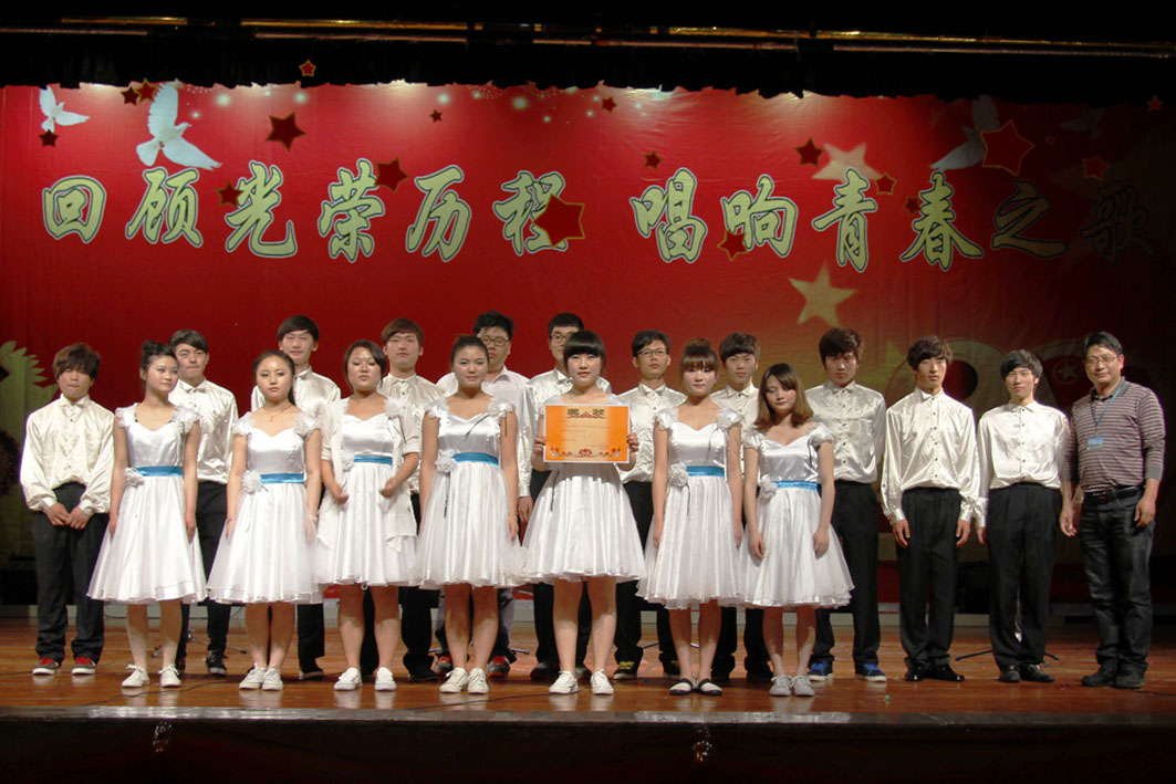 本次参赛歌曲分为必选歌曲(校歌)和自选歌曲。晚上六点,比赛正式开始。首先出场的是工商管理系代表队,他们带来的是脍炙人口的《爱我中华》,整齐的队列、和谐的音色、反映出他们良好的团队精神和饱满的感情,充分展示了当代青年锐意进取、勇于创新的崭新风貌。接下来出场的是国际学院代表队,他们带来的《走向复兴》以新颖的形式和饱满的热情抒发出勇往直前,义无返顾的豪迈气概。国贸系商英3112班代表队和建筑工程系代表队分别为我们带来了《精忠报国》和第七乐章《保卫黄河》,伴着激昂的音乐,气势宏伟的歌声给观众展示了一幅硝烟弥漫、战马奔腾、英勇抗战的壮丽画面,博得了一阵热烈的掌声,歌声立即把观众再次带入那个波澜壮阔的时代。电子信息工程系带来的《我的未来不是梦》唱出了我们的心声。