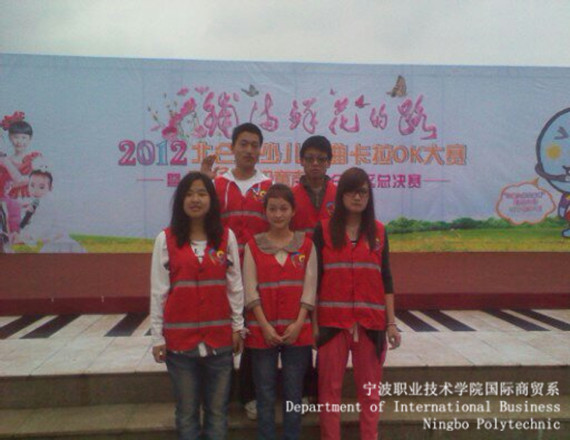 为深入贯彻落实党的十七届六中全会精神,促进北仑区文化产业的和谐发展,展示我区少年儿童音乐艺术风采,5月20日,由北仑团区委、区教育局、区少工委主办,北仑区青少年宫承办的“铺满鲜花的路”为主题的2012北仑区少儿歌曲卡拉OK大赛暨酷儿超级童声北仑赛区总决赛在北仑区凤凰山儿童文化广场拉开帷幕。共青团北仑区委副书记、北仑区少工委主任吴盈盈等相关领导出席了本次活动。国际商贸系的志愿者们为比赛现场进行了多项志愿者服务。