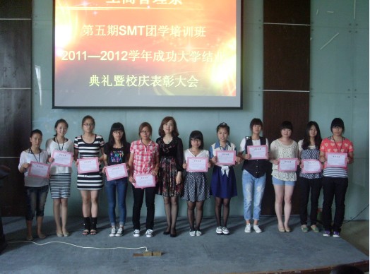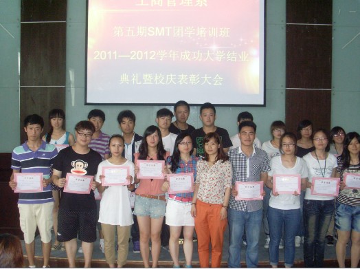 经过一学期的锻炼成长,无论是参加SMT还是成功大学的学员都从中学习到了许多做事做人的处事方法,并不断地进行自我的提升。6月6日中午12点在明德楼105教室举行了工商管理系第五期SMT团学培训班、2011――2012学年成功大学结业典礼暨校庆表彰大会。出席此次活动的有工商管理系党总支副书记沃意琳老师、团委书记陈洁琼老师、团委辅导员李建中老师、团委副书记虞凤翔、学生会副主席杨广,并有来自SMT培训班与成功大学的所有成员。