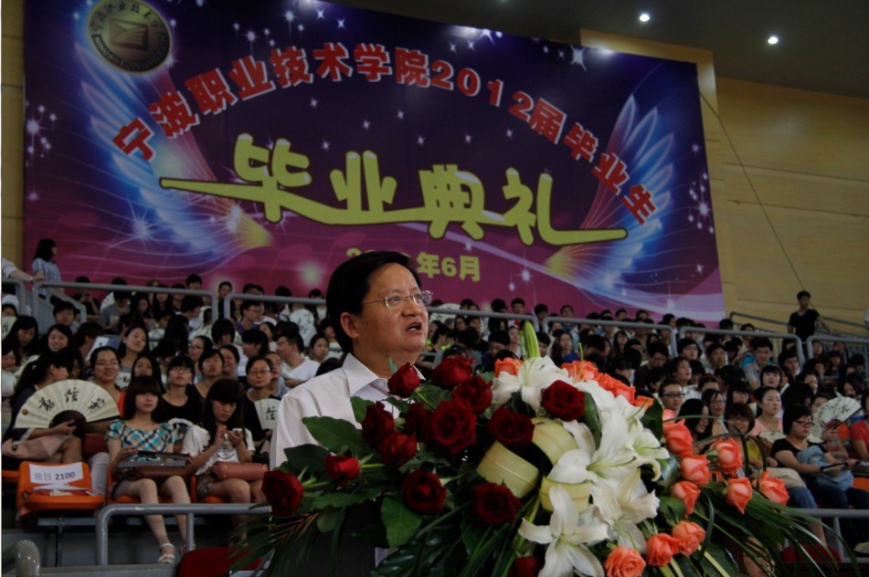 典礼上,院党委书记、执行院长苏志刚衷心祝贺2012届的同学们顺利毕业。他回顾了过去的三年里,我院涌现了一批优秀学子,有技能,敢创业,将近200位学生顺利进入了国内外本科院校继续深造。很多经济困难的同学经过自己的努力完成了从接受捐赠到自强自立,再到爱心反哺的全过程。最后,苏院长与毕业生一起分享三句话:请不要忘记你的老师、母校;请不要忘记关心父母,常回家看看;请不要忘记抬头看路,不要在日复一日的烦琐工作中迷失了方向。苏院长勉励毕业生牢记“勤、信、实”的校训,永远记得宁职院有今天的成绩,就是因为坚持了“创业、创新、创优”的精神。