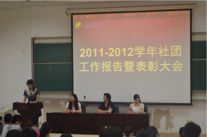 6月20日下午四点,2011―2012学年宁职院社团工作总结暨表彰大会在东校区精技楼503教室成功举行。此次大会旨在给予在过去一学年中为社团工作做出巨大贡献的集体和个人嘉奖、表彰,以致更好的推动以后学生社团联合会各项工作的开展,更好的为各社团服务。出席本次大会的嘉宾领导有学工部副部长包胜利老师、院团委副书记赖敏雅老师以及社团联合会指导老师胡丹莹。