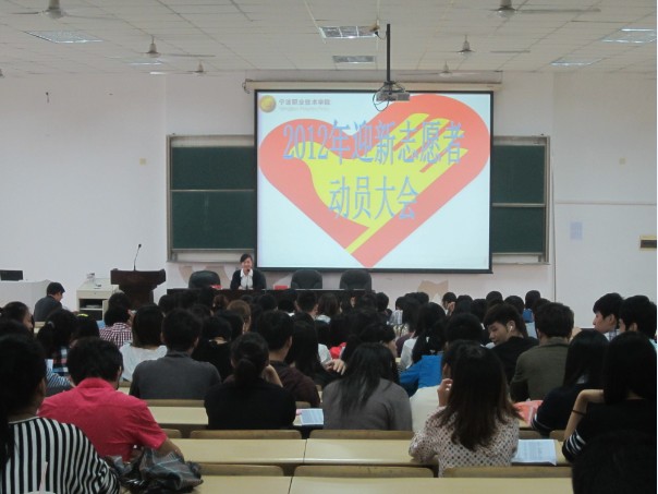 新学期,迎新生。新生是学校的新血液,新生的到来使学校又添一股活力。为了更好的服务新生,迎接新生,9月14日中午12时30分在我院东校区精技楼503教室隆重举行了迎新生志愿者动员大会。出席本次大会的老师是学工部部长郭华恬老师和院团委副书记赖敏雅老师。各部门的学生会同学和志愿者代表参加了本次动员大会。
