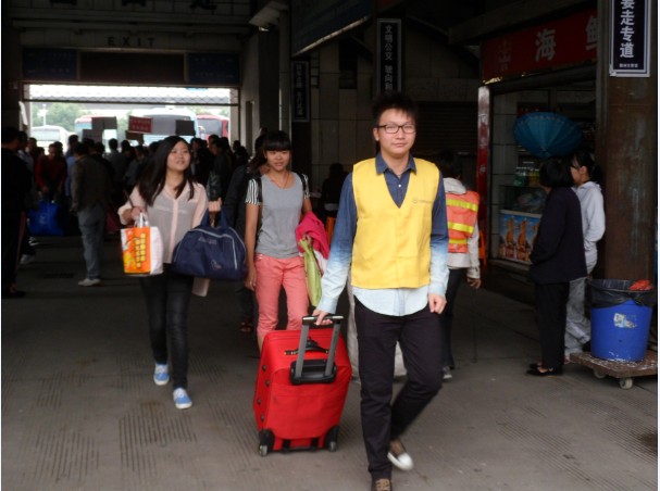 我院迎新生志愿者活动在宁波火车东站、客运中心和学校这三个地点展开。本着一颗为“服务他人,快乐自己”的心,志愿者们早早的集合好去到了各自事先分配好的工作岗位上。