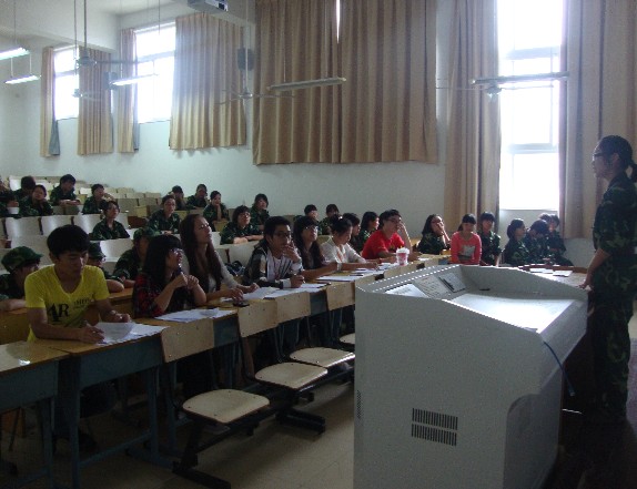 图为:新生正在众多新生面前进行自我介绍