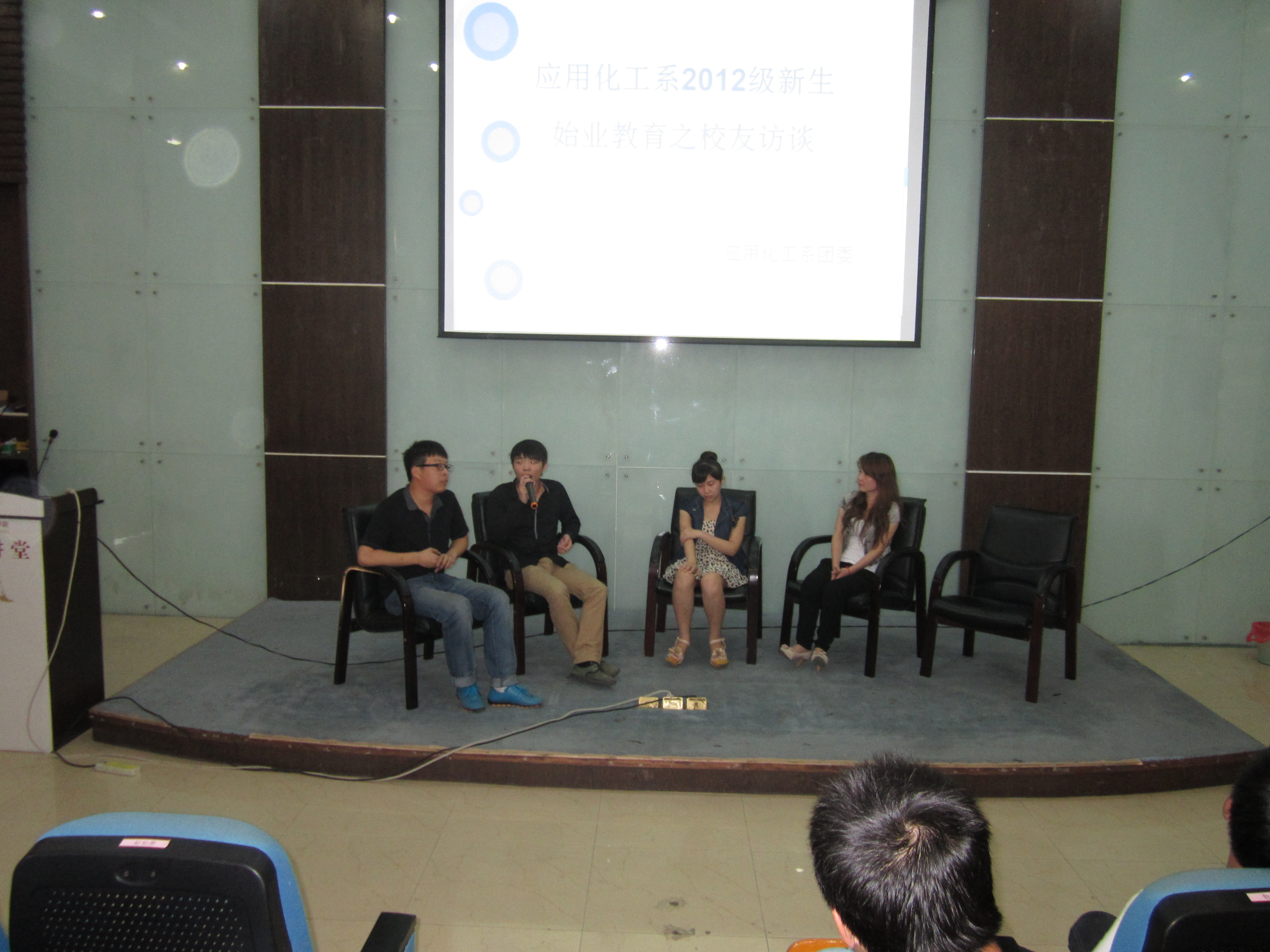 9月28日上午9点,宁波职业技术学院应用化工系举办的化工系12级新生校友访谈活动在明德楼105室隆重举行。本次活动邀请到了四位优秀的校友,和同学们分享在专升本和工作中的故事。应用化工系团委书记童燕老师及全体大一新生出席了本次活动。