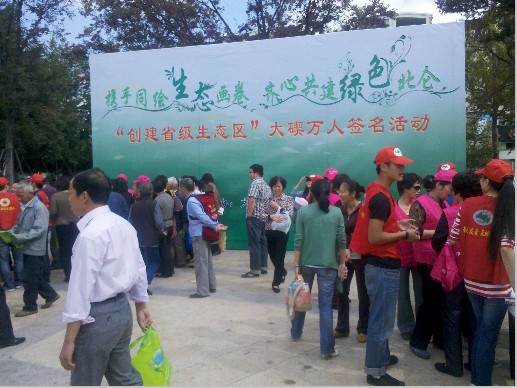 由于此次活动先前宣传到位,早已被广大群众所知晓,因此活动开始不久,自发前来签名的群众络绎不绝,大家纷纷在“携手同绘生态画卷,齐心共建生态北仑”的横幅上签下自己的名字,以此传递全力支持低碳节能行动的心声,掀起了创建省级生态区的热潮。同时,志愿者们还向大家分发了环保倡议书和环保袋,宣传环保知识,号召大家积极主动地参与到省级生态区创建中来,为建设北仑美好家园尽一份心、添一份力。现场聚集了许多年龄层次不一的群众,大家都认真的听着志愿者们宣传此次活动的意义,一起在横幅上签上自己的姓名,表明自己为建设生态北仑而做出自己的贡献。据了解,此次活动将走进社区、企业、行政村,征集万名市民签名,将省级生态区创建的相关知识传递给市民,提高群众知晓率,为创建活动营造浓厚的舆论氛围。