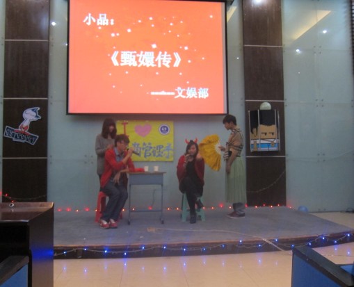 除了优秀的外联部,工商管理系的文娱部也毫不逊色,成为整场晚会的第二赢家。文娱部凭借小品《甄?传》,获得了亚军,文娱部结合时下热门的电视剧,结合自身的特点,为现场观众诠释了新版《甄?传》,带给人以独特的视觉、听觉冲击。其中,男版的甄?和华妃扮演者,凭借其逼真的语言及丰富的肢体动作,给人留下 了深刻的印象。