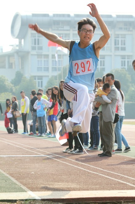 10月31日下午1点三十分举行了男子组三级跳远比赛,我们的运动员们各个昂首挺胸,精神饱满地来到现场。他们从红色的跑道上跑过来,用力一等跳板,一跳,二跳,三跳,就像一支离了弦的箭,“嗖!”一下,就跳到了沙坑里。最终,建筑系的王旭荐以13.12米的成绩夺得了冠军。