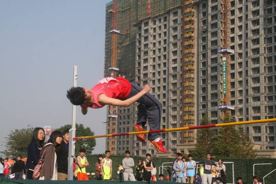 早上8点30分跳高场地,身穿红色国际学院战袍的周宁伟正在场地边进行热身训练并与学长进行心得交流。比赛正式开始后,周宁伟并没有像一般人开始1米40起跳。而是直接到裁判处要求免跳直接从1米69开始起跳。当周宁伟1米69第一次试跳就轻松跃过时,场边的同学不禁为他鼓起掌来。随着跳高杆的不断的身高,不断的有参赛运动员用光试跳次数而终止比赛。但是周宁伟并没任何的失误,稳扎稳跳战胜其它选手后,跳高的高度的已经到了1米88。助跑,起跳,身如轻燕,如同教科书中的空中分解动作,轻松跃过。金牌已然揽入囊中,然而周宁伟并没有就此停下他不断上升的高度。他向教练提出要求试跳1.92的高度。第一次试跳很遗憾的撞竿并没有成功,不过很快他就调整了状态,再第二次试跳中,他依旧成功跃过,就此市记录被打破。再此后尝试2米02时高度虽然以失败,但是仍给同学们留下了深深印像。