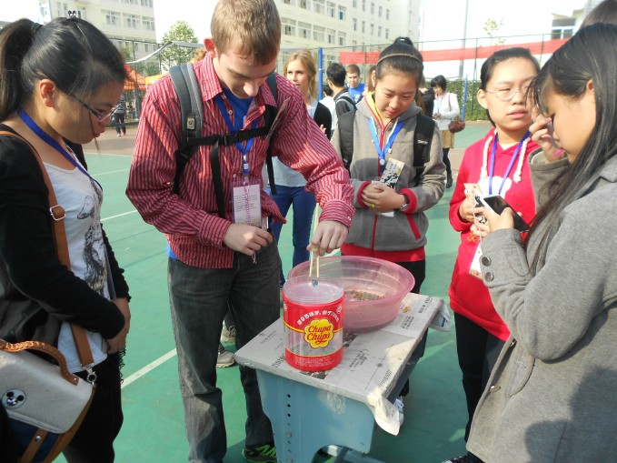 活动第二天,来自德国的交流生在援外班同学的带领下也参与进了趣味运动会中,他们对中国特有的一些项目感到很好奇,玩的不亦乐乎。在“我爱记歌词”这个活动项目的摊位前,德国交流生们合唱了一首好听的德国歌曲使活动现场的气氛达到了高潮。德国交流生的到来无疑给趣味运动会带来了更多的活力与生机。