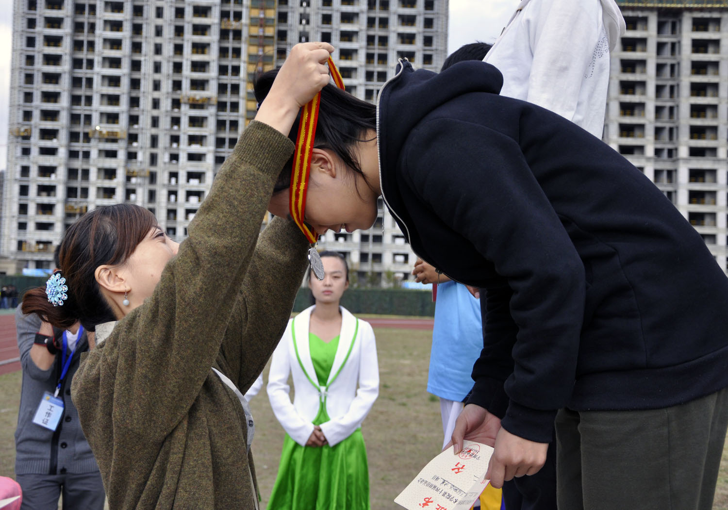 图为:化工系郑柳若参加女子三级跳的颁奖仪式