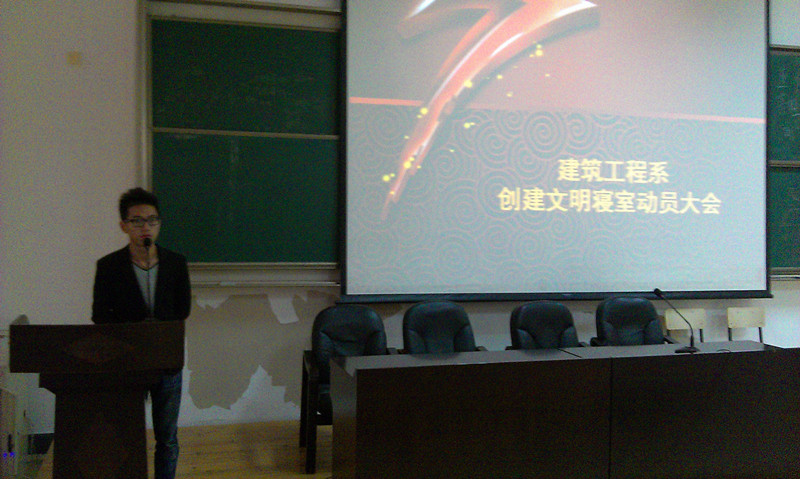 2012年10月30日中午12点30分,建筑工程系在精技楼503教室举行创建文明寝室动员大会。出席本次动员大会的有建筑工程系党总支书记丁立人老师和团委老师李建中。此次寝室文化建设动员活动旨在增强同学们的责任感和竞争意识,使我们寝室文化建设更加完善,使寝室氛围更加融洽,构建文明和谐的寝室环境。