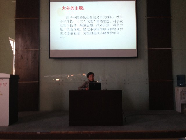 11月14日下午3点整在明德楼105报告厅,思政理论教研室的周碧蓉老师开展了一堂关于解读“十八大”报告的讲座。主题“红色密码”来源于西方国家对中国的看法,他们认为中国是一个“红色之国”。