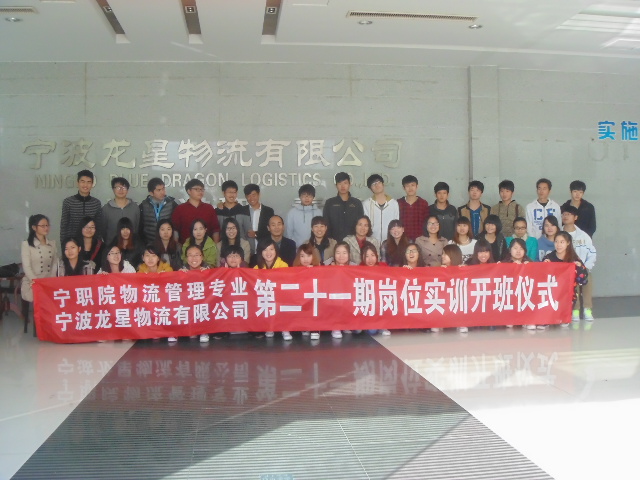 为积极加强学生们的实践操作能力,深化理论知识,加强专业技能指导。物流专业于11月13日在龙星物流公司进行第21期岗位实训开班仪式。参加本次开班仪式的领导和嘉宾有工商管理系物流专业主任王顺林老师,第二十一期模拟公司学校指导老师肖林玲老师,宁波龙星物流有限公司人力资源部经理郑洁群女士,宁波龙星物流有限公司人力资源顾问邵黎宏老师,第二十一期模拟公司企业指导老师李贝贝。