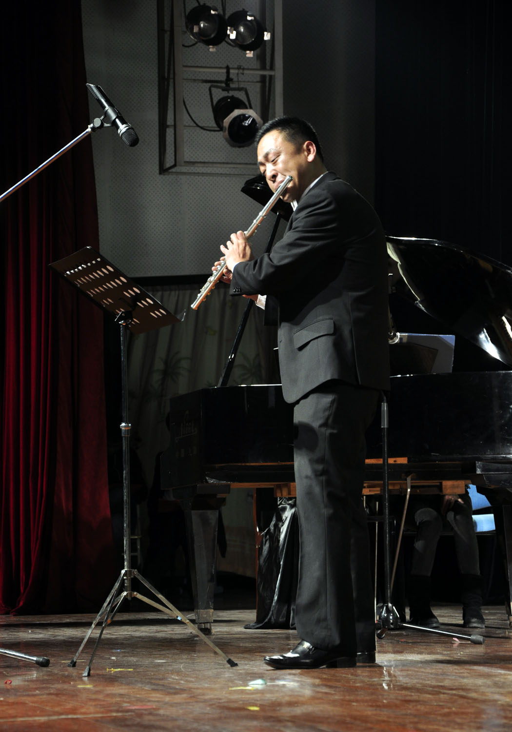 演出一开始音乐会的主角郭俊杰老师就带着钢琴伴奏家杨艳静老师,演奏了一首黄虎威的《阳关灿烂照天山》。大师级的演奏家一开场就以其高超的技能征服了在场所有人的耳膜,一曲终了会场响起了热烈的掌声。下一首同样是独奏,是被选为中央电视台天气预报节目选为背景音乐的《渔舟唱晚》。这首由黎国荃改编成长笛版的曲目,在郭俊杰的演奏下,让人感受到了另一番滋味。接下来是音乐会请来的嘉宾黄钦、舒春愉、杨颖、罗颖骏、包玲萍等人为同学们带来了同样精彩绝伦的音乐盛典。其中舒春愉、杨颖、罗颖骏、包玲萍为组合给同学们带来了一首贝多芬的《G大调小步舞曲》,全身心的演奏使同学们如痴如醉,一曲过后整个会场掌声雷动。而另一首《莫扎特525号作品一乐章》是由我校乐仗队与她们共同演奏,即使他们只经过了一天的磨合但整体呈现的效果却引得场下观众无不为之赞叹。