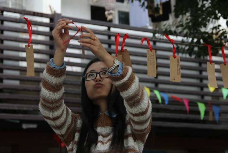 活动是在11点40分的时候开始的。 活动期间,在书吧门口的小方桌上,可以看见同学们一个个都埋头在漂亮的书签上留下对朋友、亲人的祝福。看着他们的背影,我们可以感受到他们心中播散的浓浓的爱。书签上的感恩寄语,表达了同学们对生命的热爱和感激;那一个个细腻的字迹都表达了对生命的尊敬和祈福;当他们小心的写下他们的心声时,从中显露出的是他们对父母的敬爱和感谢;大树下,绳子上系着的书签,寄托了他们对生命的感激、对父母的感激、对朋友的感激、和对老师的感激。