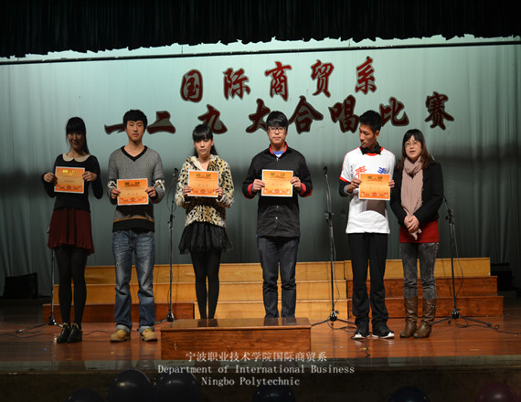 为了纪念“一二.九”运动76周年,进一步培养学生爱国热情,更好地弘扬爱国主义精神,2012年11月23日晚六点,在本校大剧院举行了国际商贸系大合唱比赛。此次比赛出于发扬团结精神,让同学们熟悉校歌的目的,召集了每个班级的同学进行校歌的演唱和自选曲目的准备工作。