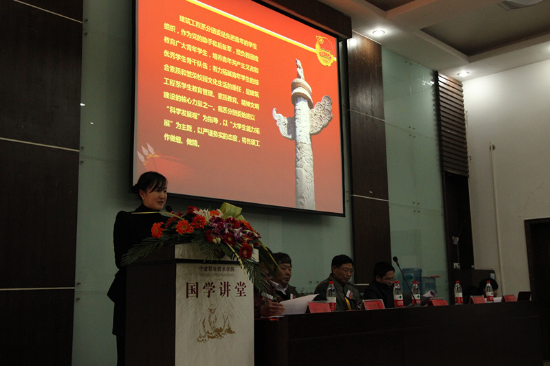 首先,王依晴同学致开幕词,她谈到,本次会议的目的在于发展宁波职业技术学院工作,力求使宁波职业技术学院建筑工程系的工作不断创新。随后,院团委副书记赖敏雅老师发表工作总结。她倡导“科学发展观”为指导,以“大学生能力拓展”为主题,以严谨务实的态度将各项工作做细做精。接着由建筑工程系主任车金如发表讲话:他说道,“世界是你们的,也是我们的,你们像清晨的太阳,寄托了我们的希望。”