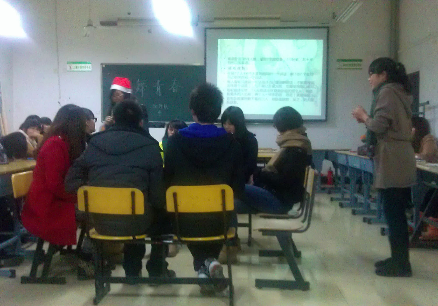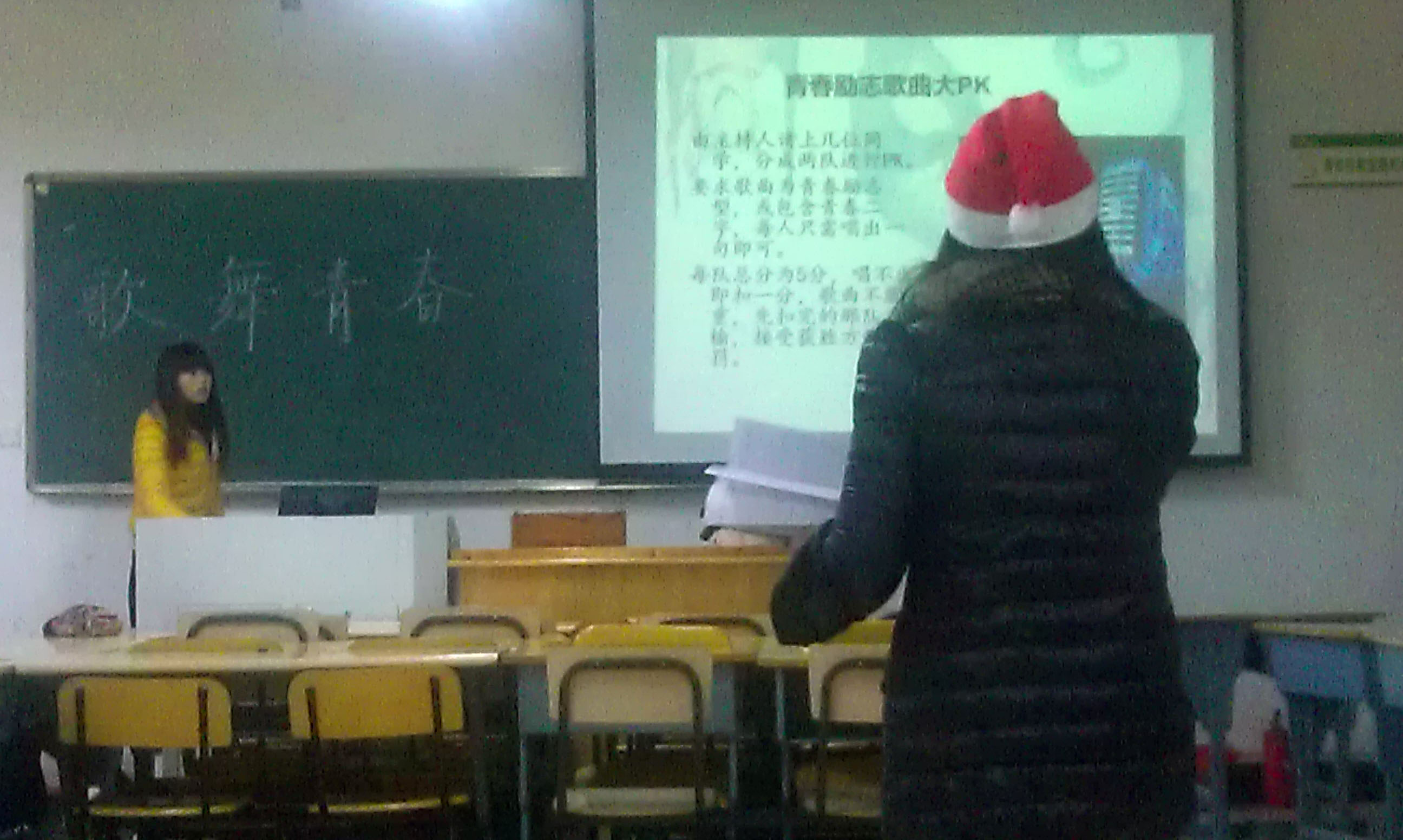 12月25日是圣诞节,主持人也戴上了圣诞帽,将节日的气氛烘托了出来。在主持人的一番开场白之后,迎来的是一首关于圣诞的歌曲。随后由班里的四个女生跳了舞蹈《摇摆》,这一段热舞过后,班级里气氛顿时由冷转热。紧接而来的是青春励志歌曲大PK的游戏,主持人将踊跃参加游戏的八名选手分成两组进行PK,分为了“姜饼队”和“油饼队”。由于青春励志歌曲的歌词库都很大,经过几次的比拼后,难以分出胜负。最后主持人出了个歌词接龙的题,大战几个回合后,由三女一男组成的“姜饼队”终于抵挡不住由四个女生组成的“油饼队”的攻击势头,最后败下阵来。随后生物班的同学们还玩了“谁是卧底”的小游戏。在这个游戏中,班主任童燕老师也被同学们一起拉上了台,当一个个无辜的人被冤死后,卧底终于出现了,游戏结束。最后一个节目是歌曲串烧,随着六位同学轮番上台献唱歌曲后,本次团日活动也接近了尾声。
