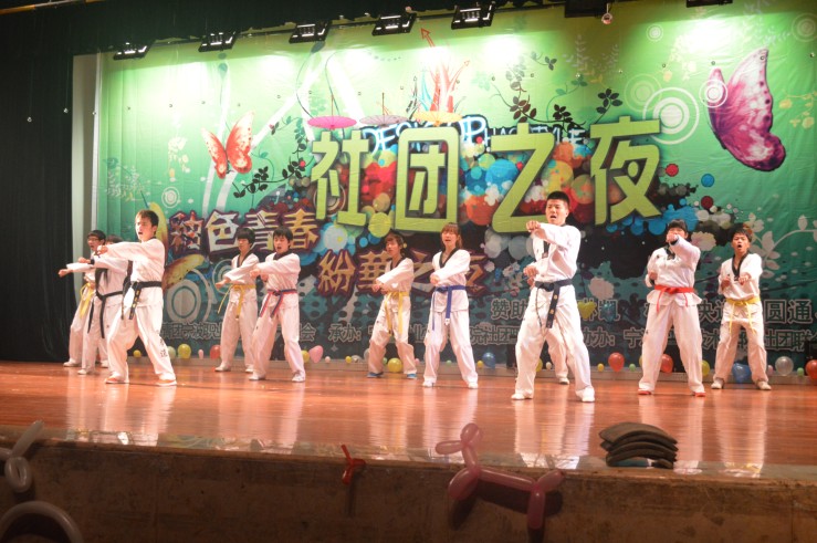 晚会由团学社主席团成员带来的的一段青春动感的《社团之夜》开场舞拉开了序幕。最吸引人眼球的跆拳道协会首先为大家带来了震撼的跆拳道表演,“久练功自纯,勤悟理自通”我校跆拳道协会的社员们把跆拳道的精神发挥的淋漓尽致,礼仪、廉耻、忍耐、克己、百折不屈,威雄的腿法带给我们力于美的结合,场下一声声呐喊使全场进入了一个高潮。