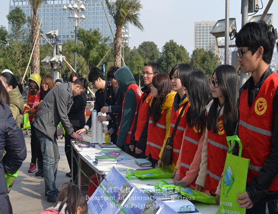 活动刚开始市民便对庞大的志愿者阵容产生了极大的好奇心。国贸系志愿者热情饱满,洋溢着笑容双手将环保袋及宣传册传递到市民手中。映眼而入的便是环保袋上的“携手共绘生态画卷,齐心共建绿色北仑”,相信市民不仅会从眼睛里看到了环保,也会从心里对环保加以重视从而做到切身的环保行动中。