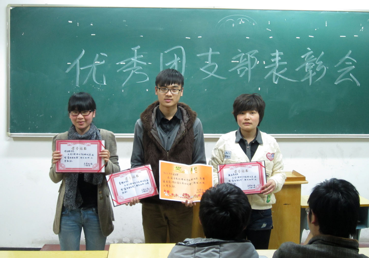 这次会议上共表彰了三个团支书和两个团支部,首先表彰的是创意团日活动支部,获得此奖项的是生物3120班,接下来表彰的是最具影响力支部,获得此奖项的是化工3123班。最后颁发的是个人奖项,获得最佳组织奖团支书的是郑亚群、董楠杰、顾忠孝三人。