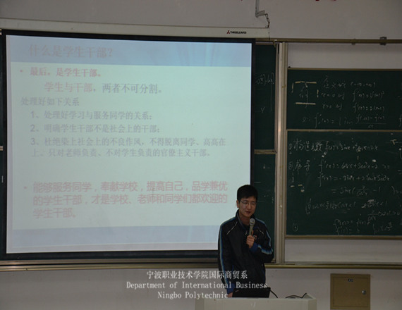 国际商贸系于2013年3月6日晚,在1103展开了这一学期的学生会团课。这学期的第一次团校课是由院团委办公室主任沈炜达,他开将的主要内容是:如何做好一名学生干部。这个话题引起了在坐同学们的深思。
