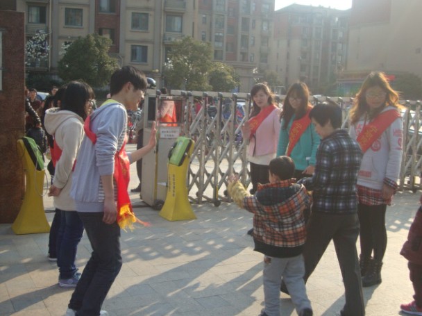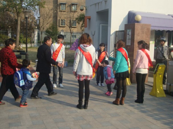 时间过了大半,很快到了放学时间,家长们刷卡进入教学区,志愿者们也开始了此次志愿活动的正题。孩子们背上小书包,一一和老师们告别,然后和家长们走出大门口。在此之前,志愿者们已经戴上红色条幅,依次站成两排,向回家的孩子与家长们挥手告别。孩子们见到这些志愿者哥哥姐姐也显得格外兴奋,都极有礼貌的向志愿者们挥手道别。孩子们的礼貌,更加坚定了志愿者们关爱幼小儿童的决心。在送走最后一个孩子的同时,志愿者们也结束了此次活动。