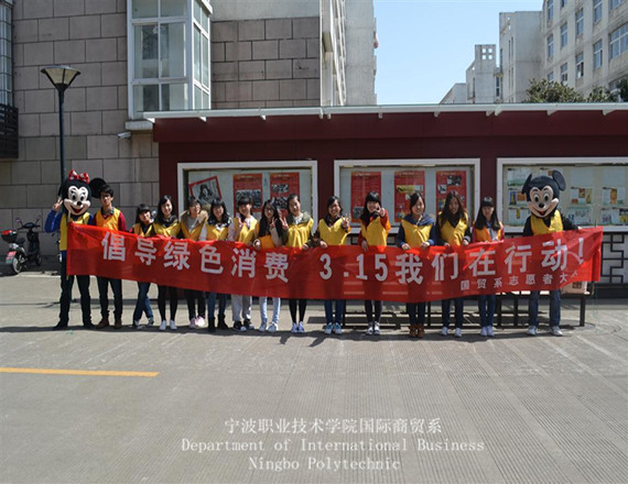 为了纪念3.15国际消费者权益保护日,更好地贯彻《消费者权益保护法》、《产品质量法》、《食品安全法》等法律法规,宁波职业技术学院国际商贸系志愿者大队于2013年3月15日在校园里举行了一场“315,我们在行动,绿色消费”的主题活动。