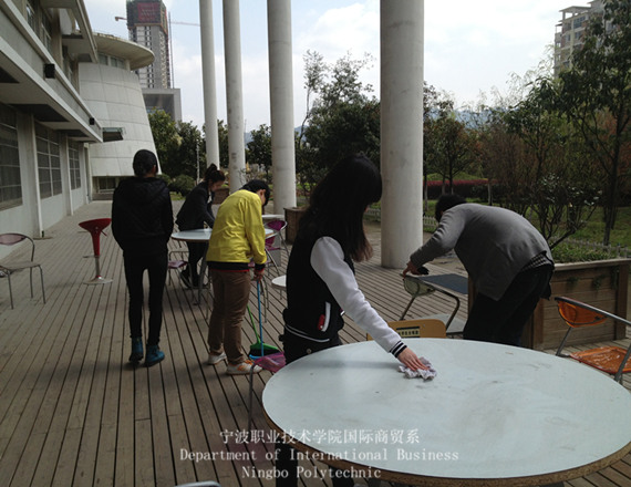 国际商贸系入党积极分子,积极响应贯彻党总支的号召,为迎接新学期上课,踊跃参加义务劳动。据了解,此次实践活动于3月25日在国贸楼进行,规定所有教室的墙壁上的脚印,窗户上贴的纸片,桌上的字迹等都要抹干净,抹不掉的都要用砂纸打磨掉。这对大多数女生来说十分辛苦,但她们分工明确,分配完工作以后就起劲的干了起来,有的教室墙上的脚印特别多,她们就用洗干净了的拖把认真地擦的干干净净的。最为困难的是,在国贸楼咖啡吧外的露天桌椅,由于长时间放在室外,座椅都染上灰尘,同学们经过几次的擦拭才将露天座椅擦干净。