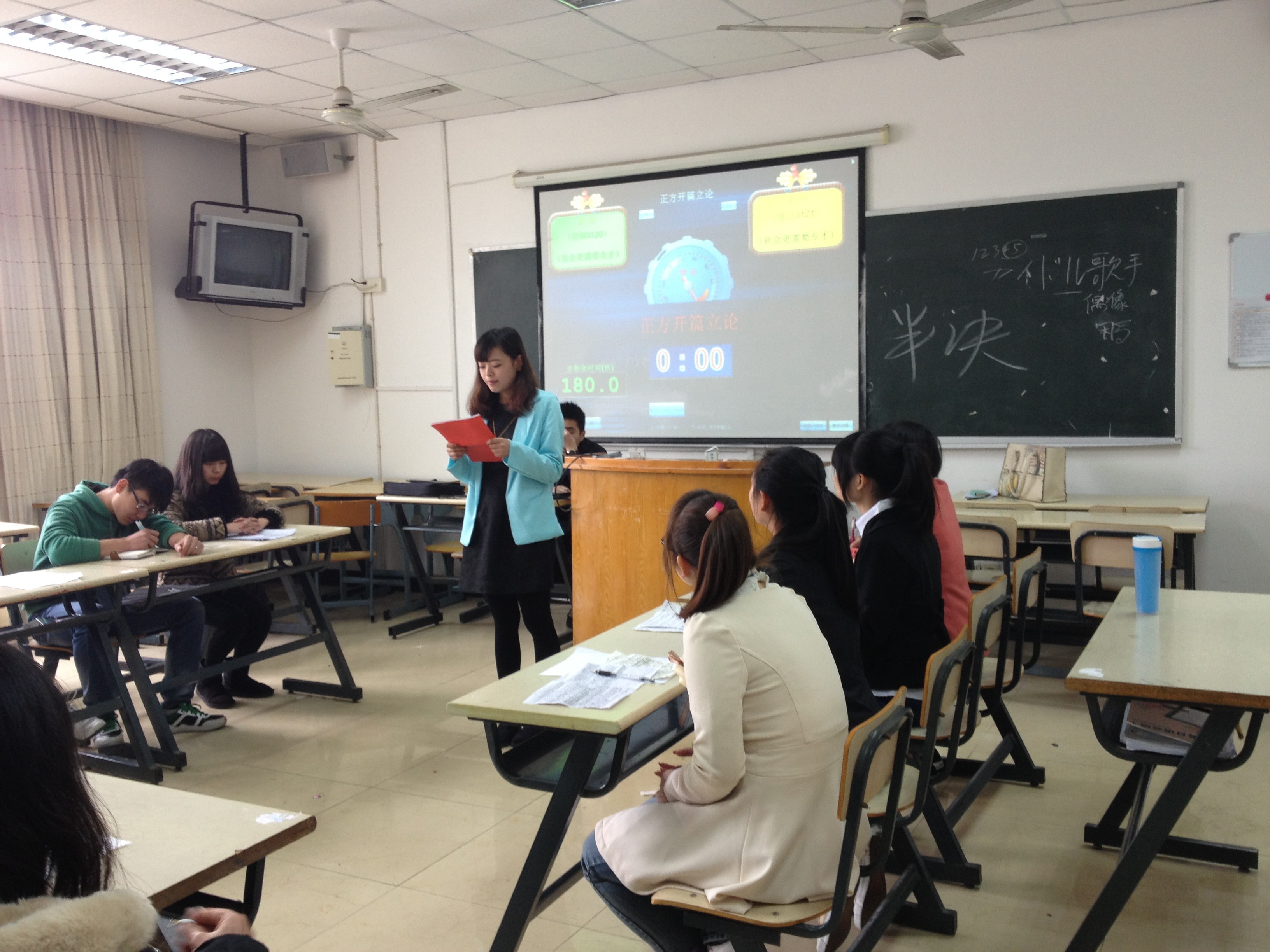 3月29号我院辩论赛在外语楼311举行半决赛.本次辩论赛开始!围绕社会更需要全才还是专才这一主题火热展开。由学习部部长陈颖、外联部部长卢方莉和纪检部部长杨海堂担任评委。主持人、评委、辩手、观众都已经就绪。12:10分,辩论赛开始了。