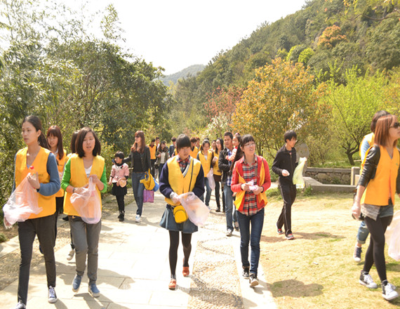 九峰山是宁波北仑4A级风景区,是一个景色优美的旅游胜地,那里山清水秀,远离了尘世的喧嚣,很多的游客慕名而来,因此许多问题也随之产生。其中乱堆垃圾这一现象给九峰山的环境带来了严重的影响。为了还一个美丽清新的风景家园,宁波职业技术学院国贸系志愿者大队的同学们于2013年3月30日下午,身着黄色马甲来到了九峰山景区进行志愿者服务。