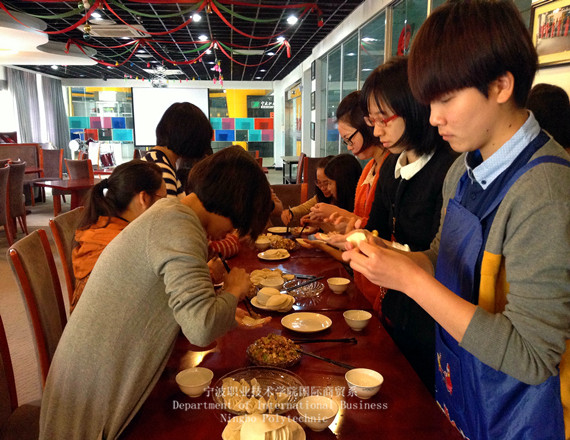 活动分两个环节。首先是包饺子。大家三三两两地围坐在一起,边包饺子边讨论着心得,从学习生活到人生哲学,无话不谈,气氛热烈。不知不觉中,充满创意的饺子诞生,有的显示了男子的霸气,有的透露着南方女子独有的灵动,看着样式各异的饺子,同学们捧腹大笑,乐开了花。在活动的进行中,每个人都以极高的热情参与,其乐融融,脸上流露的是满心的欢喜。人才济济的国际商贸系学生党支部也不乏料理专家,不少同学大展身手,也有些同学通过活动收获了第一次包饺子的经历。在大家的同心协力下,数百个饺子很快就齐齐列队了。