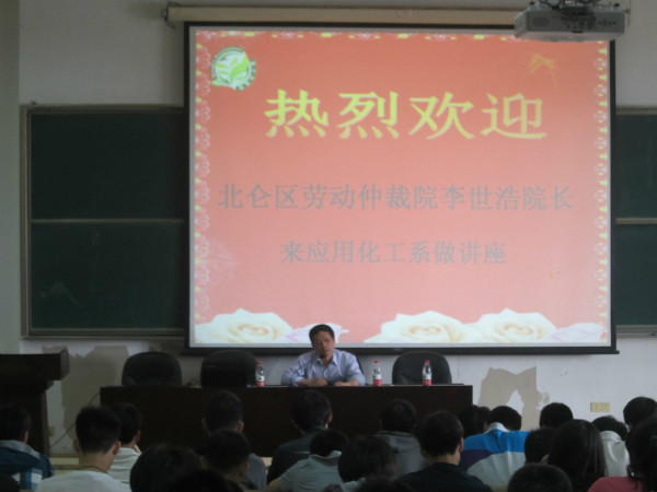 2013年5月9日中午13:30,宁波北仑区仲裁院院长李世浩莅临我校,在东校区2503为我校11级应用化工系学生做顶岗实习前的“劳动法”讲座。宁波市劳动仲裁院主要工作职责是承办处理宁波市劳动争议仲裁委员会管辖的劳动争议案件,办理仲裁委员会授权或交办的其它事项。