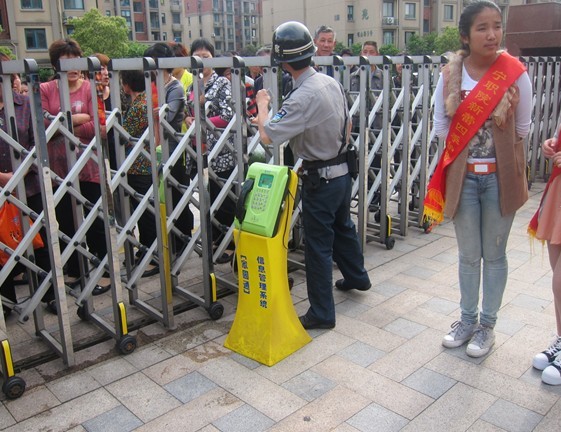 图为:志愿者与家长在等待孩子放学