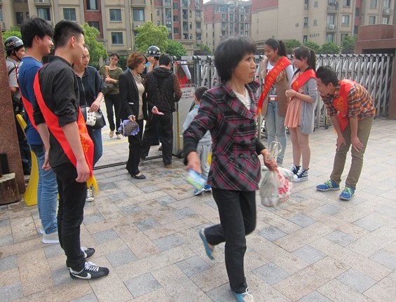到了新蕾幼儿园,和保卫室的叔叔交代了一下,志愿者们便开始了此行的目的,大家拿出红色的礼仪腰带挂在胸前,然后分成两排,整齐地站在校门口等待着小朋友们的出现。没过多久,家长们便陆续到来,站在校门口,很快门口就站满了前来接自家孩子的家长们。