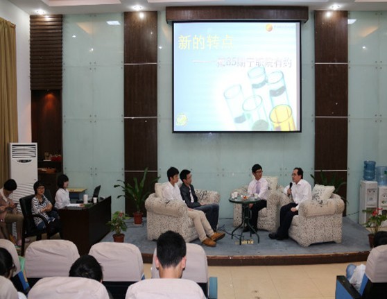 首先,主持人沈煜佳同学向在座的同学们介绍请来的嘉宾们。在做完详细的介绍之后,主持人开始向嘉宾们提问。李来福学长曾经也是一名宁职学生,在校期间曾在跟随张慧波院长在校做产品研发工作,在此期间曾获得2009“扬农杯”全国石油和化学职业院校化学检验工技能大赛高职组个人全能三等奖,2009“扬农杯”全国石油和化学职业院校化学检验工技能大赛高职组团体三等奖等奖项。作为在座同学们的学长,他向大家讲述了很多关于大学生活学习的认识。他说,要做好自己本职的事,好好珍惜现在拥有的资源。曾经我以宁职为荣,如今宁职以我为荣,李来福学长很好的诠释了这句话。李来福学长已经有了好几年的就业经验,在采访中他提到,就业其实也是一个学习的过程,在学习和就业的过程中,他碰到了很多了,给了他帮助。在本期的宁职有约中,他也提到了自己非常想要感谢的人,那个人就是带领他在校做产品研发工作的张慧波院长。此外另一名嘉宾楼副总也向大家讲述了很多自己的经历。关于研发药物这方面,主持人提出了很多疑问,楼副总也都一一的做出来解答。他说,研发其实是一件很枯燥的事,要吃的起苦,耐的住乏味,才能看到最后的成功。