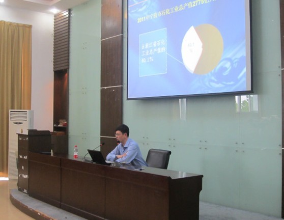 下午两点整,金知微局长开始为同学们介绍起了他的主讲内容。首先,他为同学们介绍了宁波石化的产业发展概述和宁波石化产业的现状。接着他给同学们又剖析了一下2007年到2012年宁波石化产业的主要经济指标完成情况。然后,金知微局长又介绍了各园区的主要装置和各园区的在建项目。最后,他为同学们又介绍了一下宁波石化工业的特点、宁波石化产业的发展模式还有动向。时间过的很快,转眼间金知微局长要讲的内容就讲完了,他在最后留出了一点时间,让同学们提出自己心里的问题然后自己为同学们解答。良久大家都没有提出心中的问题,大概过了五分钟左右,一位自告奋勇的女同学站了起来向金局长提了个问题,她问的是企业对女生的要求是否很高,金局长告诉她在各个岗位上女生还是很多的,只要自信、不害怕,企业就会选择你。看到这位女生勇敢地提问,接着就一连有四个男生提出了自己的疑问,金知微局长也耐心地为他们一一解答。