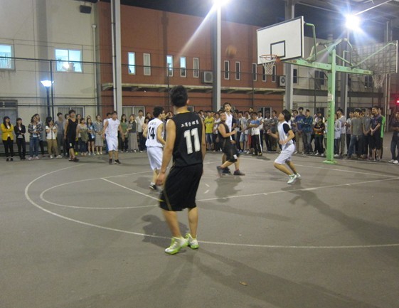 此次比赛,工商管理系和海天学院均派出实力最强的选手。晚上7点多,参加比赛的各位篮球运动员们早已齐聚篮球场内,个个满怀激情,积极做着热身运动,队员之间不断地鼓励打气,相互给予彼此最大的信赖。随着裁判员的一声哨响,篮球场上的气氛立即活跃起来。比赛一开始就进入白热化,双方队员在场上进行激烈的拼抢,你争我夺,一轮轮地抢球,每个动作争锋相对,投球动作潇洒,他们高昂的斗志点染在场的观众们和志愿者拉拉队的热情。此起彼伏的喝彩声、鼓掌声将紧张的赛事一次次推向高潮。工商管理系的队员们配合默契,在跳球中首先抢占先机,11号一路快攻,穿过海天学院严密的防守,一个起跳,三分进篮,骤时掌声喝彩同时响起。然而海天学院也毫不示弱,他们利用默契的配合,精准的投篮,渐渐的将比分缩短。赛事愈演愈烈,双方队员快攻、进球、防守、反攻,每次都赢得满堂喝彩。