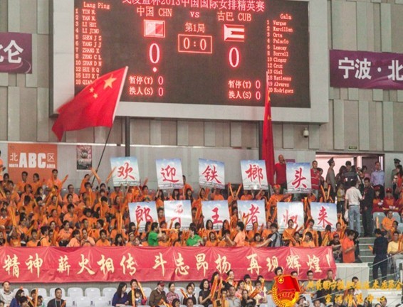 球迷们穿着黄色的T恤,高举着“宁波职业技术学院学生会,欢迎铁榔头郎平王者归来”的旗帜。他们的呐喊声响彻云霄,震耳欲聋。每当中国女排遇到困难时,他们便会高喊着“中国,加油!”中国女排在口号中鼓舞下,防守显得异常顽强。而当中国队赢球时,“郎平,郎平,我爱你;中国,中国,是冠军!”的口号也会随之响起。在中国队发球时,呐喊声便会停下来,以免影响女排姑娘的发球,避免不必要的失误。现场的球迷们显得非常的专业,不但爱球,而且懂球。