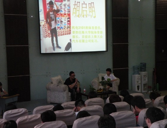 胡启明在校期间担任海天学院体育部部长,同时兼任机电3101班体育委员,目前在上海大众汽车有限公司工作。胡启明学长从实力和机遇两方面谈及如何从竞争者中脱颖而出,并强调了工作中人际交流的重要性。另一位嘉宾王乾宇是海天学院机电一体化专业2010届毕业生,目前在海天精工售后服务部工作,也担任我院实践指导教师的工作。王乾宇向同学们解释了大小企业工作的差别,及在校时的创业和兼职的心得体会。以切身经验告诉大家在工作中如何与师傅相处,并强调了心理抗压,释放压力的重要性。