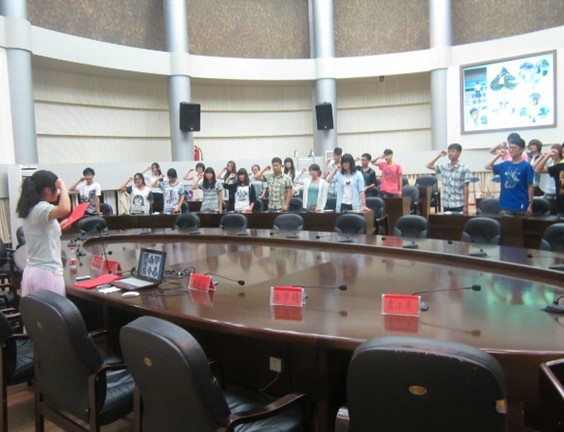 图为:倪珊珊学姐带领同学们宣誓