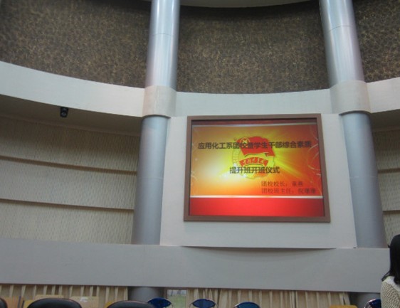 月30日晚六点,应用化工系在国贸楼国际会议厅举办团校提升班开班仪式,主要是为应用化工系校暨学生干部提升综合素质。今晚出席该仪式的有团委书记童燕老师,团委副书记倪珊珊同学,办公室主任张红燕同学以及系学生会各部门的部长。团校开课时间是由2013年5月至下半年11月。