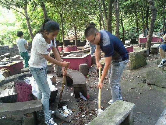 大家拿着扫帚与簸箕,两两搭配,进行着高效率的清扫活动。多余的人则是拿着钳子去钳那些夹在树上或灌木丛中的塑料袋与餐巾纸削。经过两个多小时的不懈努力,烧烤区变得整洁干净不少,大家看到自己的成果都很满足与欣慰。打扫完最脏乱的烧烤区,大家又接着上山去进行此次的环保行动。一路上经过大家的身影,一路上平添一份环保清洁。