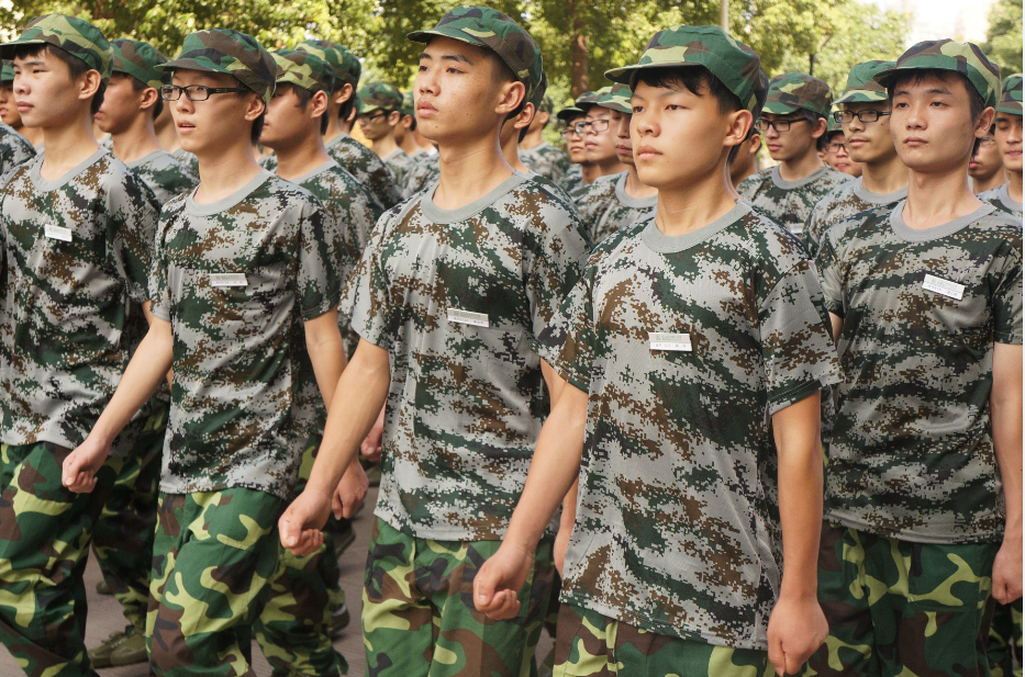 烈日之下,训练场上,统一的军装,笔直的腰杆,整齐的步伐,叫喊声如雷鸣般响亮,一双双炯炯有神的眼睛里看不到一丝的疲惫。巾帼不让须眉,海天学院的女生和男生们一起训练,虽然人数少,但很惹人注目,动作干脆利落、步伐铿锵有力,不叫苦不叫累更不怕晒黑,用“铿锵玫瑰”四个字形容一点也不为过。酷暑难耐,有的新生身体不舒服却强忍着站军姿、踢正步、喊口号,接受教官的严格训练;有的是休息几分钟继续训练,豆大的汗水浸湿了耀眼的迷彩服,但他们并不在意这些,只想着千万不给班级拖后腿。