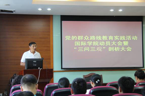 9月19日下午,国际学院在102会议室召开了党的群众路线教育实践活动动员大会暨“三观三问”剖析大会。出席本次会议的有总院督导张子库院长、国际学院周英华老师、国际学院领导班子、教师党员、专业主任以及学生党员代表等。