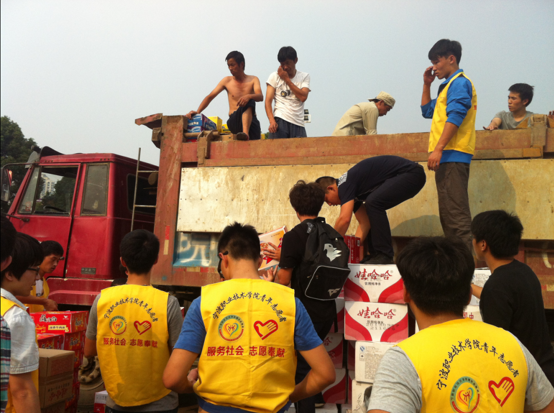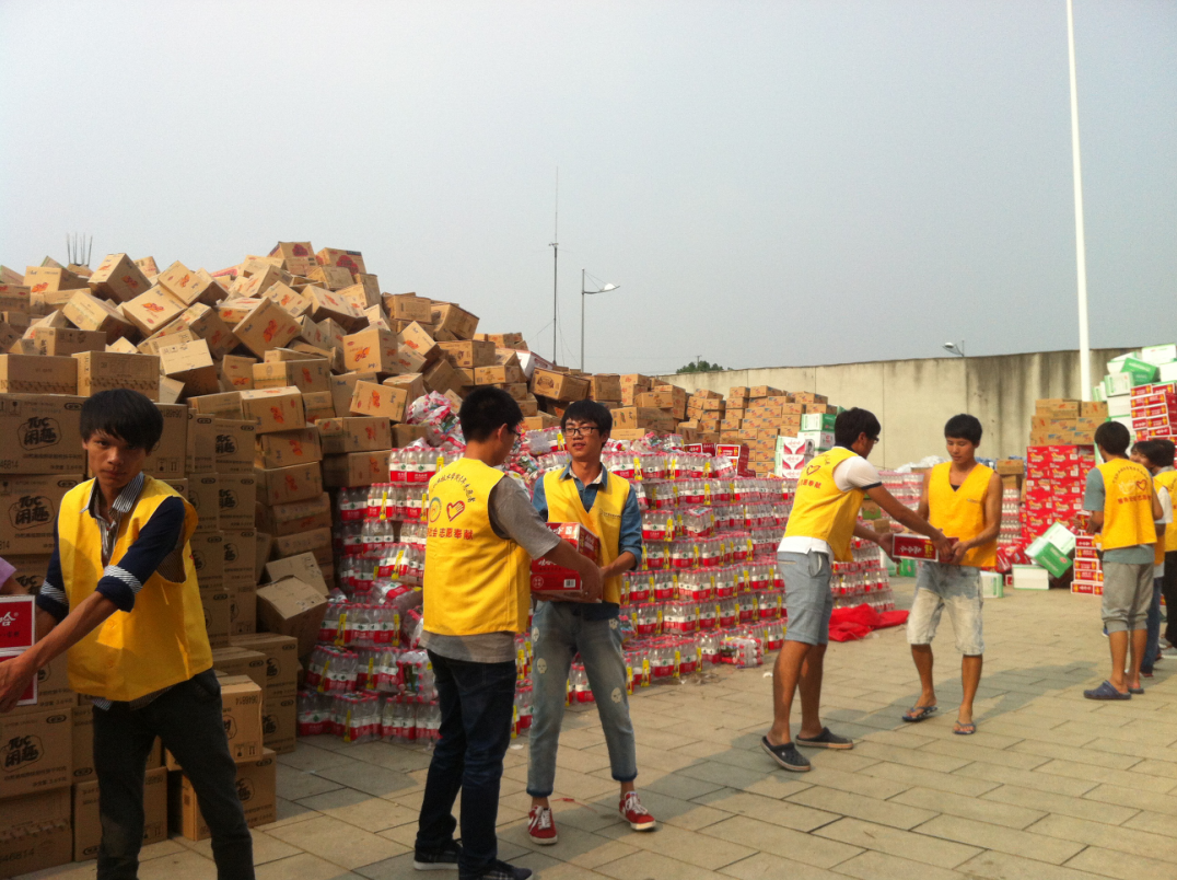 各地送来的救援物资源源不断,一到灾区,我院志愿者们就忙碌起来了。身穿黄马甲的他们10人一小组排成几十列,分头迅速的把面包、饮用水、胶鞋、蜡烛等物资搬运到开往灾区的卡车上。烈日之下,短短几十分钟便让他们汗流浃背,可即便如此,他们依然奉献着绵薄之力。
