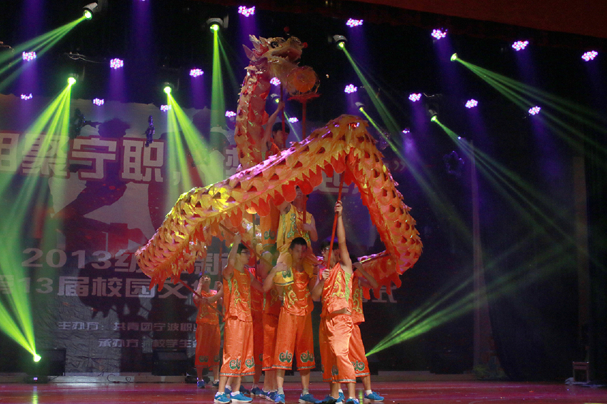 掌声雷动,音乐响起,一抹抹绿色的身影在舞台上翩翩起舞,在她们优美的舞姿中,迎新晚会拉开了序幕。歌舞、戏曲、朗诵、乐器演奏等精彩的节目为观众呈现了丰盛的视听盛宴。用萨克斯演奏的《小步舞曲》让同学们心旷神怡;一段充满青春朝气,活力四射的舞蹈《Lovey.dovey》,让同学们激情澎湃;诗歌朗诵《宁职,我爱你》展现了宁职学子对我院深深的眷恋;独舞《爱莲说》将东方的神韵展示得淋漓尽致;戏曲协会的《十八相送》演绎了一段唯美的爱情;武术《武越沧海》让同学们感受到了中国武术的博大精深;舞龙协会的同学们用矫健的动作,飞舞的布龙,描绘出了一幅《蛟龙出海》壮阔图。整场晚会精彩不断,高潮迭起,赢得台下阵阵掌声,欢呼声一浪高过一浪。