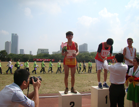 随着发令枪声,拉拉队摇旗呐喊的鼓声震天响。我系运动员徐栋波同学更是以他完美的速度获得了全场的喝彩,一圈,两圈,三圈,徐栋波一个一个的赶超,全场的呐喊将比赛推向高潮,最后一百米,成了大家聚焦的画面。加油声更激烈了,锣鼓声更紧了,最终,徐栋波同学不负众望,取得了第二名的好成绩。此外,我系另外两名同学也以顽强的姿态跑完了全程。